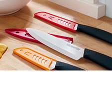 Shilling ceramic kitchen knife set with hardwood handles.